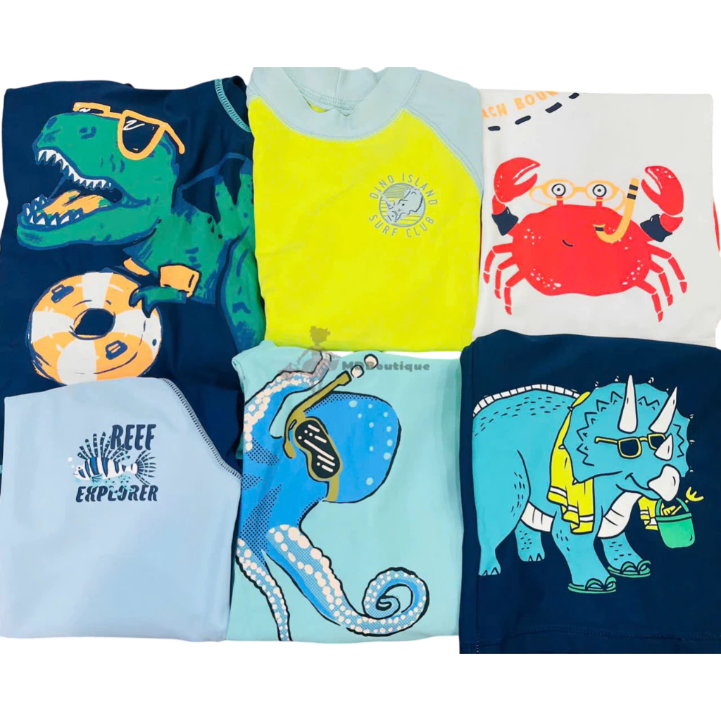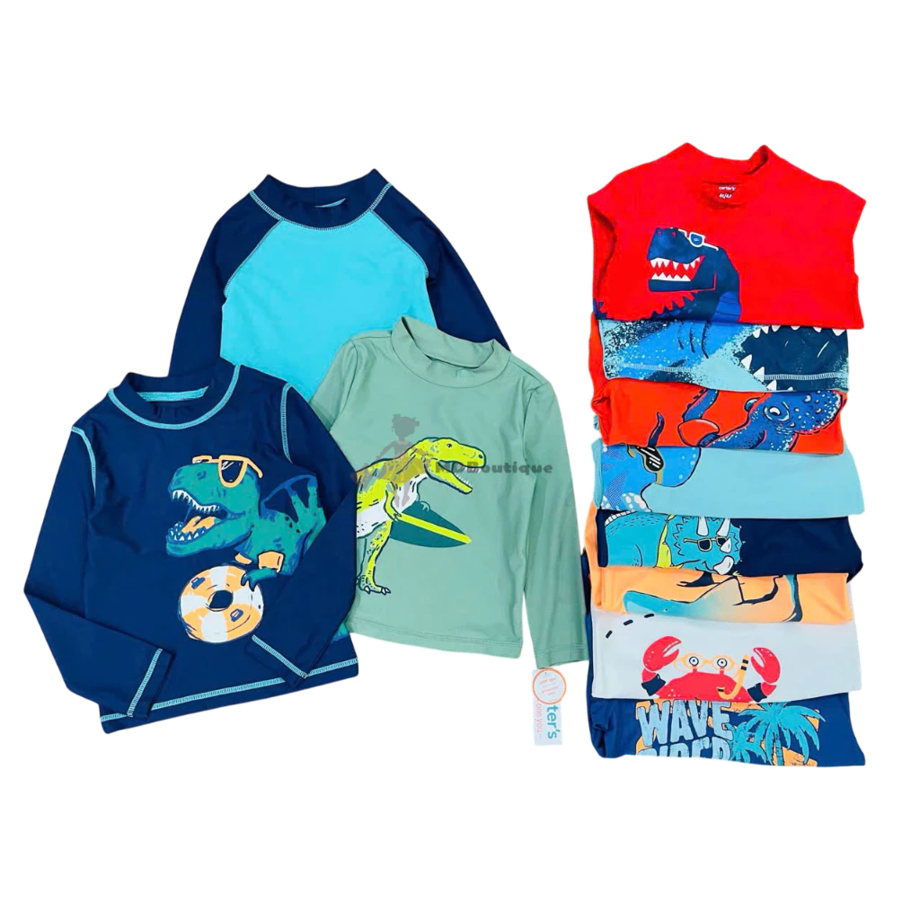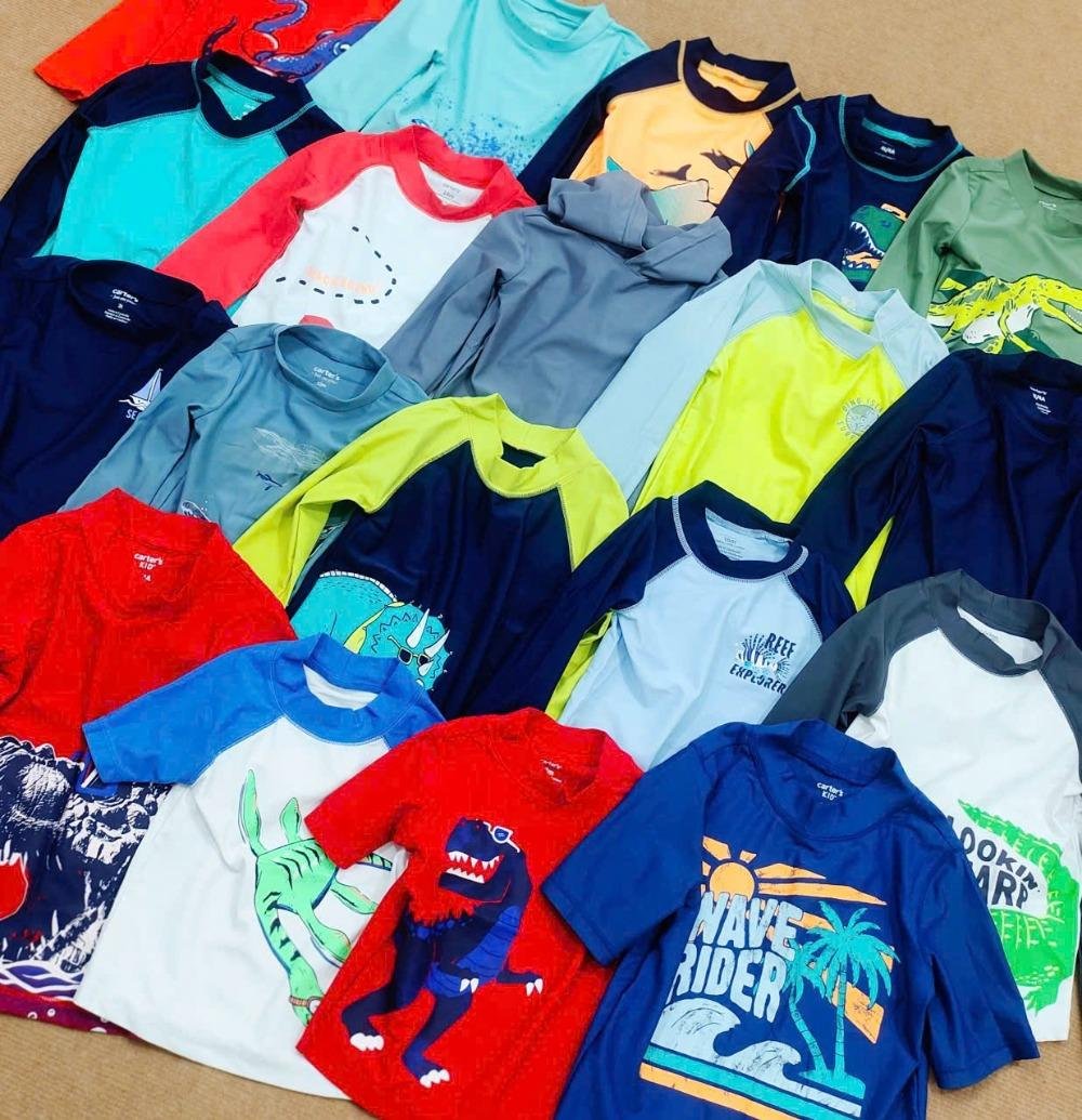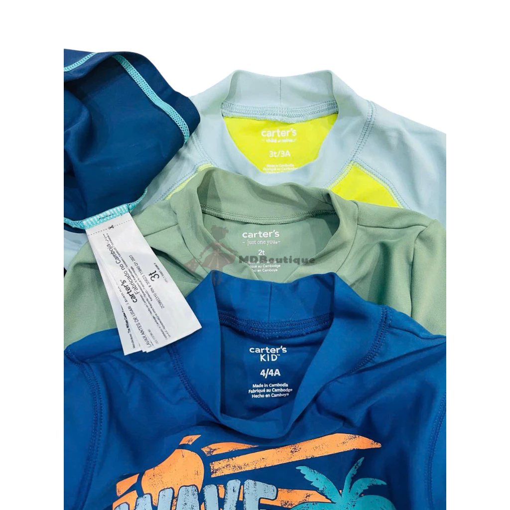 [Bán sỉ không bán lẻ], set 2 áo bơi bé trai cho mùa hè năng động, Size 12m-2y (size 2y nhiều hơn). Hiệu Carter, made in Cambodia, hàng xuất dư xịn.